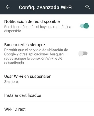 Ya en la primera página veremos la opción a la que nos referimos, Buscar redes siempre. Esta opción debe estar desactivada si lo que queremos es evitar que el móvil busque redes WiFi cuando nosotros tenemos desactivada la conectividad WiFi para ahorrar WiFi. Al fin y al cabo, cuando desactivamos esta conectividad, es precisamente porque queremos ahorrar batería, no para que sean Google u otras apps las que puedan seguir buscando redes WiFi.